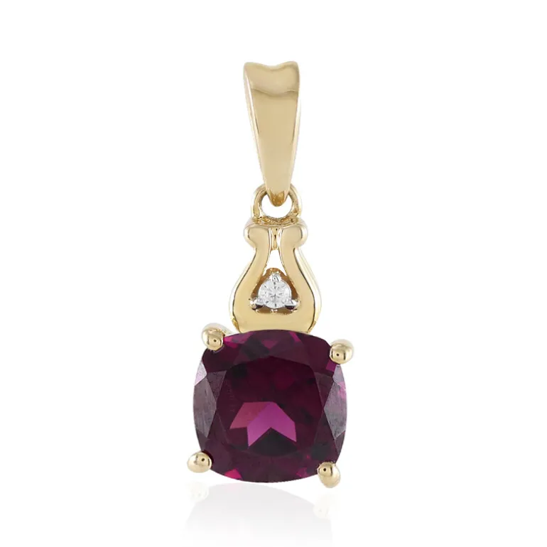 Tauchen Sie ein in die tiefen Magentatöne dieses Granatanhängers aus Tansania, der mit einem Hauch von Vintage-Charme gefertigt ist. Der Stein von 2,138 Karat hat einen antiken Kissenschliff, der seine leuchtende Farbe und Brillanz hervorhebt. Ein zarter kambodschanischer Zirkon von 0,018 Karat sitzt anmutig darüber und verleiht ihm einen Hauch von Glanz. Der Anhänger ist in klassisches 375er 9K-Gelbgold gefasst und wiegt etwa 1,32 Gramm. Dieser Anhänger verleiht sowohl der Tages- als auch der Abendgarderobe einen luxuriösen Touch und verspricht, eine vielseitige Ergänzung für jede Schmucksammlung zu sein.