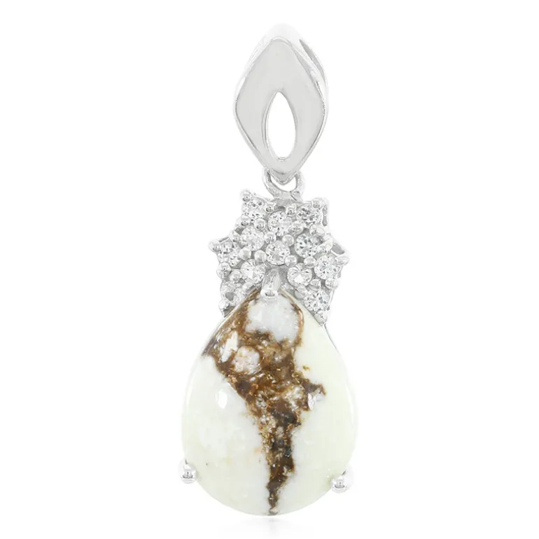 Entdecken Sie die ruhige Schönheit dieses brasilianischen Magnesit-Anhängers, gekrönt von einem Cluster funkelnder weißer Topase von insgesamt 0,323 ct. Darunter hängt ein tropfenförmiger Magnesit-Cabochon mit einem Gewicht von 7,29 ct, der durch seine Schlichtheit besticht. Der Anhänger ist sorgfältig aus hochwertigem 925er Sterling Silber gefertigt und wiegt ca. 2,7 g. Sein einzigartiges Muster und der Kontrast zwischen reinem Weiß und erdigen Brauntönen machen ihn zu einem bezaubernden Schmuckstück für die Freizeit oder besondere Anlässe. Kombinieren Sie diesen Schatz mit einer eleganten Silberkette, um jedem Ensemble einen Hauch von Eleganz zu verleihen.