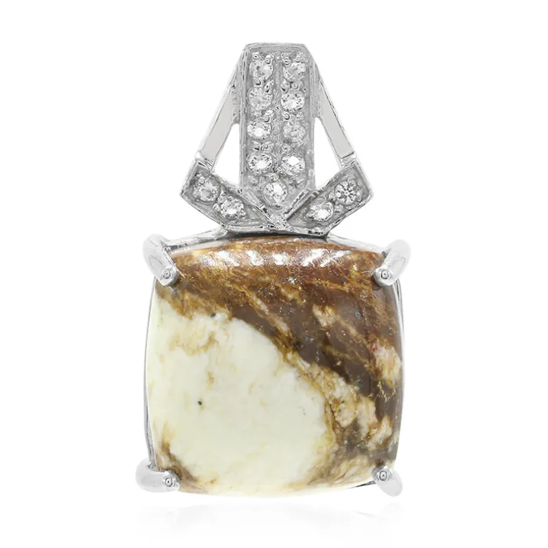 Entdecken Sie die bezaubernde Anziehungskraft dieses atemberaubenden Anhängers, der einen majestätischen brasilianischen Magnesit von 11,21 Karat im antiken Kissen-Cabochon-Schliff präsentiert, der von 13 schimmernden weißen Topasen von insgesamt 0,143 Karat brillant ergänzt wird. Der Anhänger ist aus exquisitem 925er Sterling Silber gefertigt und wiegt ca. 2,51 g. Sein vielseitiges Design und die erdigen Farbtöne sind eine schicke Ergänzung für Freizeit- und Abendkleidung und machen ihn zu einer außergewöhnlichen Wahl für jede Schmucksammlung.