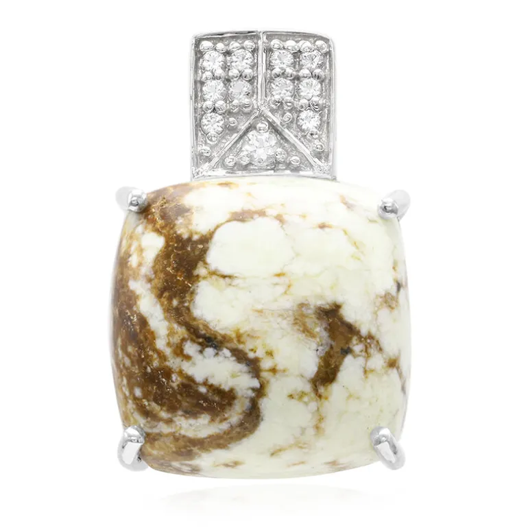 Dieser exquisite Anhänger zeigt einen atemberaubenden 15,04 ct antiken Kissen-Cabochon aus Magnesit, der durch weiße Topas-Akzente von insgesamt 0,147 ct wunderbar ergänzt wird. Das elegante Design und das einzigartige Muster des Anhängers aus 925er Sterlingsilber machen ihn zu einem außergewöhnlichen Accessoire. Dieses Schmuckstück eignet sich sowohl für formelle Anlässe als auch für Freizeitausflüge und verleiht jedem Outfit einen Hauch von Raffinesse. Ideal für alle, die einzigartigen Edelsteinschmuck zu schätzen wissen.