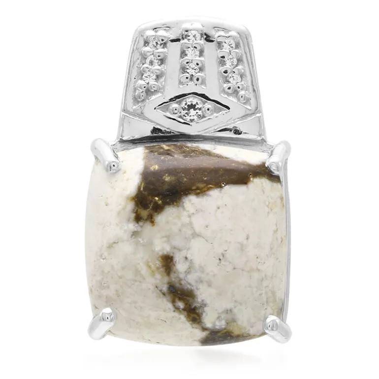 Entdecken Sie die Anziehungskraft dieses atemberaubenden Anhängers mit einem 9,19 Karat großen brasilianischen Magnesit-Kissencabochon, der durch einen funkelnden weißen Topas von insgesamt 0,048 Karat ergänzt wird. Dieser Anhänger aus poliertem 925er Sterling Silber ist ein Zeugnis zeitloser Eleganz. Die einzigartigen Muster im Magnesit machen jeden Anhänger zu einem einmaligen Schmuckstück. Er eignet sich sowohl für die Freizeit als auch für formelle Anlässe und passt sich jeder Umgebung an und verleiht Ihrem Ensemble einen Hauch von Raffinesse.