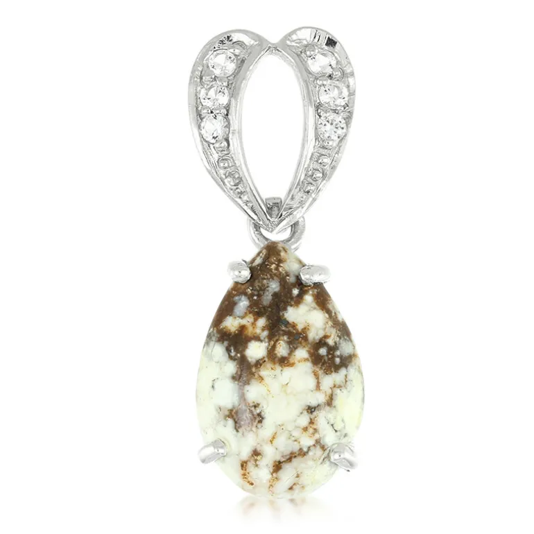Entdecken Sie die natürliche Eleganz unseres brasilianischen Magnesit-Anhängers mit einem tropfenförmigen Cabochon von 4,05 Karat als Herzstück. Der in 925er Sterlingsilber gefasste Anhänger ist mit sechs funkelnden weißen Topas-Steinen besetzt, die den milchigen Farbtönen des Magnesits einen Hauch von Brillanz verleihen. Dieser Anhänger eignet sich sowohl für den Alltag als auch für besondere Anlässe und kann eine Vielzahl von Outfits ergänzen. Seine erdigen Töne machen ihn zu einem idealen Accessoire für neutrale Farben oder als Kontrast zu dunkleren Farben.