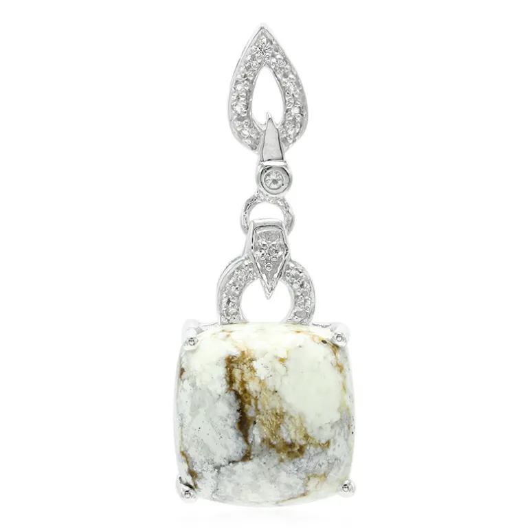 Entdecken Sie die ruhige Schönheit dieses brasilianischen Magnesit-Silberanhängers mit einem Magnesit im Kissenschliff von 10,48 Karat und einem zeitlosen antiken Cabochon. Die natürlichen, erdigen Farbtöne des Edelsteins werden elegant durch 17 funkelnde weiße Topase von insgesamt 0,1 ct ergänzt, die in hochwertigem 925er Sterlingsilber gefasst sind. Mit einer Größe von 38×14 mm ist dieser Anhänger ein subtiles, aber dennoch faszinierendes Schmuckstück, das perfekt geeignet ist, um Freizeitoutfits aufzuwerten oder der Abendgarderobe einen Hauch von Raffinesse zu verleihen.