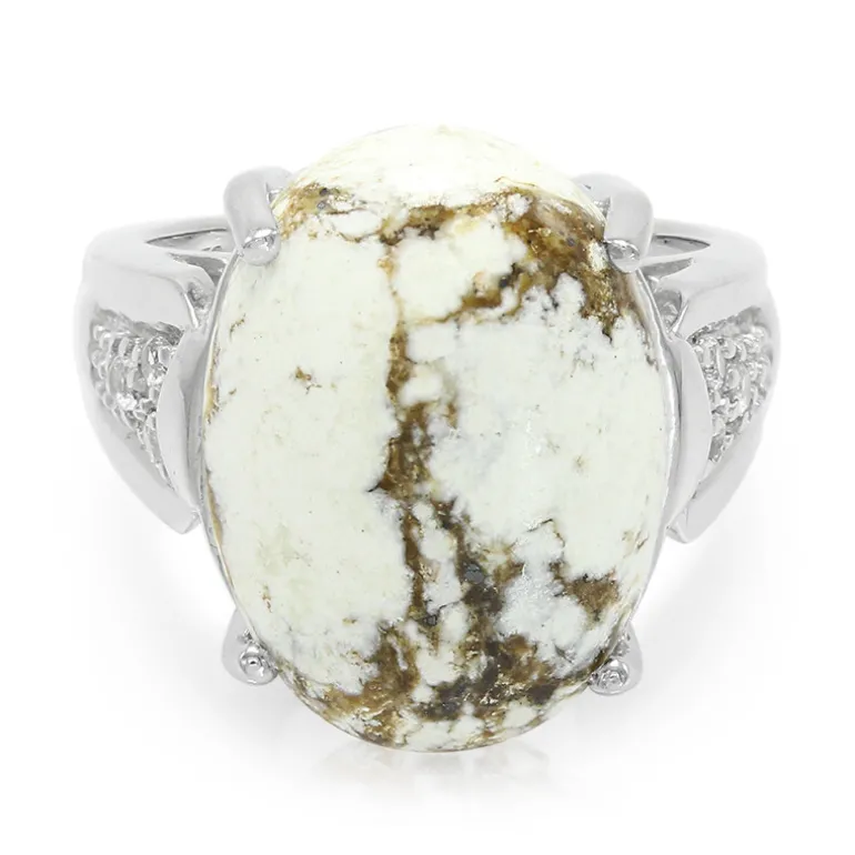 Dieser unverwechselbare Ring zeigt einen atemberaubenden ovalen Cabochon aus brasilianischem Magnesit mit einem Gewicht von 8,08 ct und einer beeindruckenden Größe von 18 x 13 mm. Die cremefarbenen Töne des Magnesits werden durch sechs funkelnde runde weiße Topase im Brillantschliff ergänzt, die dem Ring einen subtilen Schimmer verleihen. Gefertigt aus hochwertigem 925er Sterlingsilber und mit einem Gewicht von ca. 4,7 g verbindet dieser Ring zeitloses Design mit einem Hauch von moderner Eleganz. Er eignet sich sowohl für den Alltag als auch für besondere Anlässe und ist eine vielseitige Ergänzung für jede Schmucksammlung.