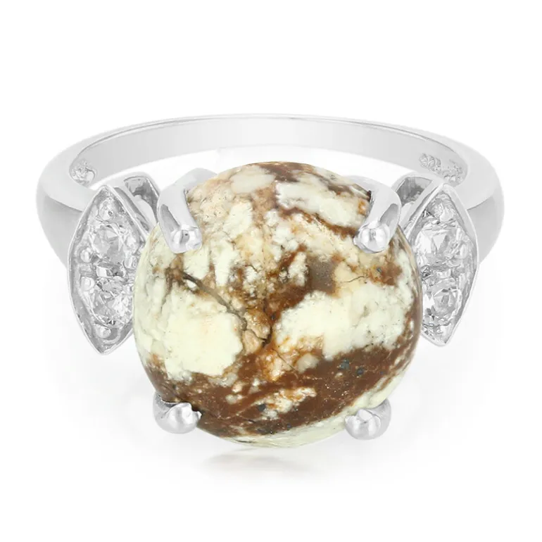 Entdecken Sie die erdige Eleganz unseres Rings aus brasilianischem Magnesit, gekrönt von einem runden Cabochon von 5,55 Karat und flankiert von 4 funkelnden weißen Topas-Steinen von insgesamt 0,229 Karat. Gefertigt aus hochwertigem 925er Sterling Silber, verbindet dieses einzigartige Schmuckstück natürliche Schönheit mit einem Hauch von Funkeln. Dieser Ring ist ideal, um Ihrem Look einen Hauch von Bohème zu verleihen. Er ist ein echter Hingucker an lässigen Tagen oder auf Kunsthandwerkermärkten. Kombinieren Sie ihn mit einem fließenden Kleid oder einer strukturierten Bluse für ein mühelos schickes Ensemble.