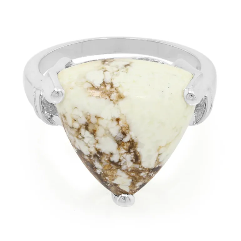 Entdecken Sie den einzigartigen Charme des Magnesit-Sterlingsilberrings. Der 7,62 Karat schwere Trillium-Cabochon aus Brasilien ist in 925er Sterlingsilber gefasst. Das Design des dreizackigen Steins ist auffallend und modern und eignet sich sowohl für zwanglose Ausflüge als auch für elegante Veranstaltungen. Kombinieren Sie es mit neutralen oder erdfarbenen Ensembles für einen raffinierten Touch.