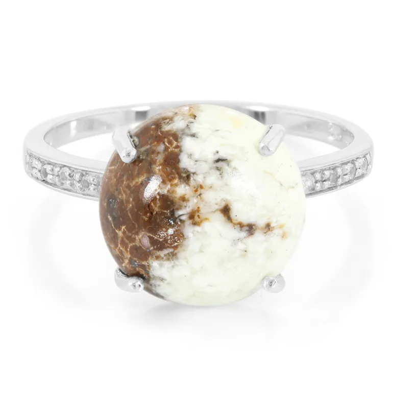 Dieses exquisite Stück zeichnet sich durch einen markanten brasilianischen Magnesit aus, der in einen glatten, runden Cabochon geschliffen ist. Mit einem Gewicht von 5,71 Karat und einem Durchmesser von etwa 12 mm sitzt er anmutig auf einem Sterlingsilberband. Um das Band herum befinden sich 10 runde Brillanttopase aus Brasilien mit einem Gesamtgewicht von 0,05 Karat, die ein subtiles Funkeln erzeugen. Der gesamte Ring hat ein Gesamtgewicht von 5,76 ct, gefasst in ca. 1,93 g 925er Sterlingsilber. Das Gleichgewicht zwischen dem erdigen Magnesit und den schimmernden Topasen macht diesen Ring zu einer vielseitigen Ergänzung für jedes Outfit, ideal für ein legeres Brunch oder einen eleganten Abend.