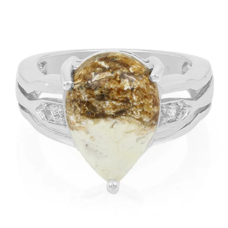 Dieser tränenförmige Magnesit-Cabochon-Ring ist mit seinen erdigen Tönen und natürlichen Mustern ein optisches Fest. Der aus Brasilien stammende Hauptedelstein von 4,46 ct wird von zwei glitzernden weißen Topasen flankiert, die zusammen ein Gesamtgewicht von 4,51 ct ergeben. Eingefasst in fein verarbeitetes 925er Sterling Silber, ist dieser Ring ein Highlight für jede Gelegenheit. Als schicke Ergänzung zu Ihrer Garderobe können Sie dieses einzigartige Schmuckstück mit Ihrer Alltagsgarderobe kombinieren oder es für einen besonderen Anlass aufwerten.
