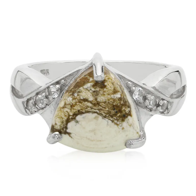 Entdecken Sie den einzigartigen Charme dieses Rings aus Sterlingsilber mit einem 2,49 Karat großen brasilianischen Magnesit, der von sechs funkelnden weißen Topasen flankiert wird. Das aus hochwertigem 925er Sterlingsilber gefertigte Schmuckstück verbindet natürliche Schönheit mit einem Hauch von Brillanz. Die erdigen Töne des Magnesits machen ihn vielseitig für den Alltag oder besondere Anlässe tragbar. Kombinieren Sie ihn mit Ihrem Lieblingsoutfit für einen eleganten, aber unaufdringlichen Look.