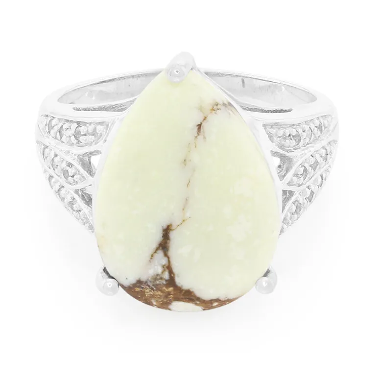 Dieser Ring aus Sterlingsilber zeigt einen atemberaubenden tropfenförmigen brasilianischen Magnesit-Cabochon von 9,57 Karat, eingefasst in ein kunstvoll gestaltetes Band, das mit 0,092 Karat funkelnden weißen Topasen verziert ist. Die einzigartige Musterung des Magnesits macht dieses Stück zu einem außergewöhnlichen Accessoire. Er eignet sich perfekt, um jedem Ensemble einen Hauch von Eleganz zu verleihen und passt sowohl zu legerer als auch zu formeller Kleidung. Ein echtes Statement für alle, die unverwechselbaren Schmuck zu schätzen wissen.