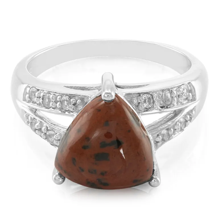 Entdecken Sie den erdigen Charme dieses Rings aus Mahagoni-Obsidian, gekrönt von einem Stein im Trilliant-Cabochon-Schliff von 3,06 Karat aus den USA. Eingebettet in 925er Sterlingsilber kontrastieren die warmen, rostroten Farbtöne wunderschön mit dem Funkeln von 10 runden weißen Topasen im Brillantschliff aus Brasilien von insgesamt 0,171 Karat. Das schlichte Design und die Größe von 29 x 21 mm machen den Ring zu einem idealen Schmuckstück für lässige Ausflüge und elegante Abende. Kombinieren Sie dieses einzigartige Accessoire mit neutralen Tönen, um seine natürliche Schönheit zur Geltung zu bringen.