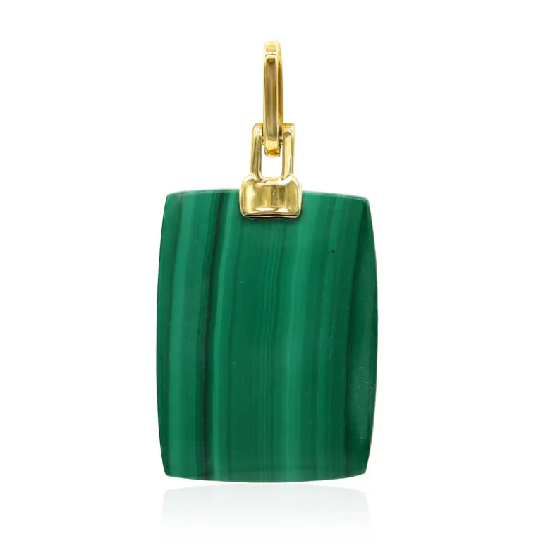 Erleben Sie die Faszination dieses raffinierten Malachit-Anhängers aus 14 Karat Gelbgold. Der brasilianische Malachit von 10,58 Karat hat einen antiken Cabochon-Schliff, der seine tiefgrüne Ausstrahlung unterstreicht. Er eignet sich sowohl für legere als auch für formelle Anlässe und wertet jeden Look mühelos auf. Ideal für alle, die zeitlose Eleganz und die erdige Schönheit natürlicher Edelsteine zu schätzen wissen.