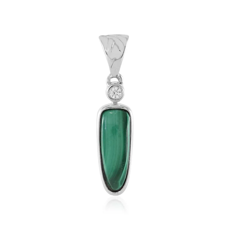 Entdecken Sie die Faszination dieses eleganten Anhängers mit einem satten, tiefgrünen 2,9-karätigen Malachit, der durch seine elegante Verlängerung ein markantes Profil erhält. Der Fancy-Cabochon-Schliff hebt die natürliche Bänderung des Steins hervor, der aus der mineralreichen DR Kongo stammt. Darüber sorgt ein funkelnder Zirkon von 0,032 Karat aus Tansania für einen Hauch von Brillanz. Dieses Schmuckstück ist aus platiniertem 925er Sterlingsilber gefertigt, das sowohl Haltbarkeit als auch ein luxuriöses Finish garantiert. Es ist ideal, um sowohl der legeren als auch der formellen Kleidung einen raffinierten Touch zu verleihen und ist ein vielseitiges Accessoire für jeden Anlass.
