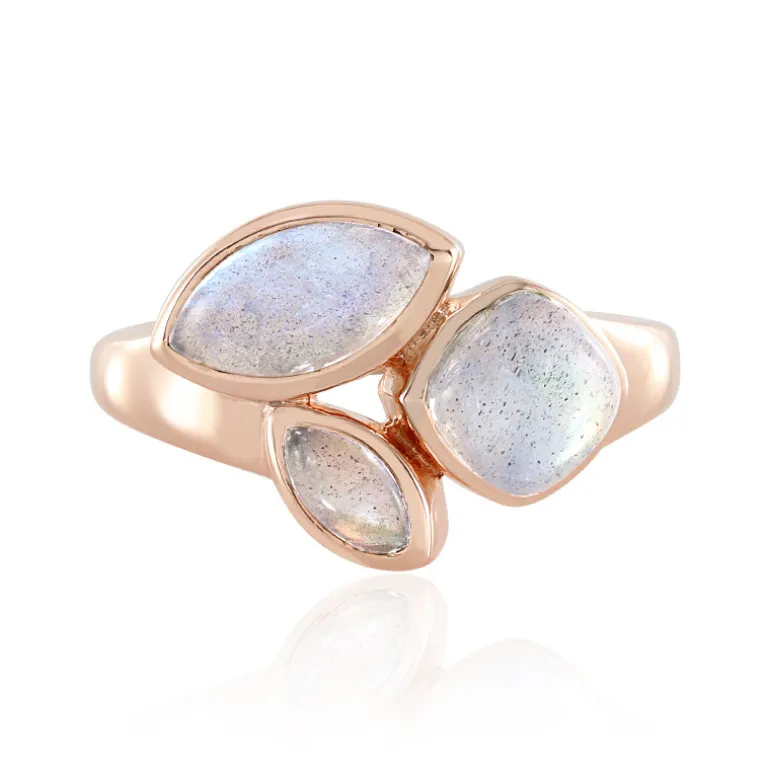 Wir präsentieren unseren faszinierenden Ring mit einem Trio aus marquisen und kissenförmigen Maniry-Labradoriten mit einem Gesamtgewicht von 2,52 Karat. Jeder Stein, der von der exotischen Insel Madagaskar stammt, hat einen einzigartigen Farbton – von mystischem Blau bis zu erdigem Kupfer. Der Ring ist aus 925er Sterlingsilber mit einer romantischen Rosévergoldung gefertigt und wiegt etwa 3,34 Gramm. Dieser Ring ist ideal, um Ihrem Outfit einen Hauch von Skurrilität zu verleihen und wird bei jeder Veranstaltung für Gesprächsstoff sorgen. Lassen Sie dieses Schmuckstück zu einem schlichten Kleid die Hauptrolle spielen oder werten Sie Ihre Freizeitkleidung mit seinem bezaubernden Schimmer auf.