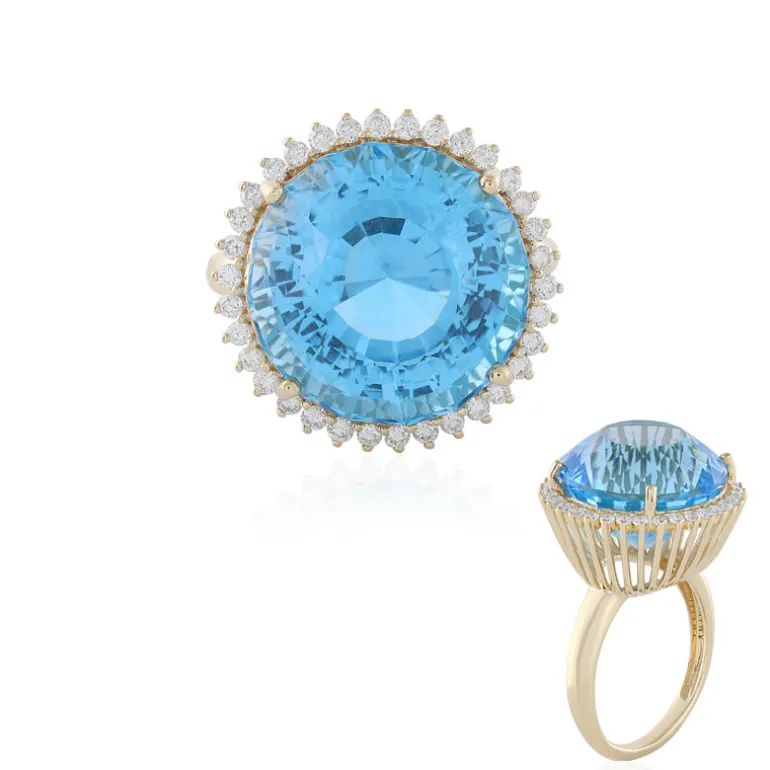 Entdecken Sie die luxuriöse Anziehungskraft dieses anspruchsvollen Marambaia-Topasrings. Mit einem atemberaubenden runden brasilianischen Topas im Phantasieschliff von 22,373 Karat in der Mitte ist dieses Stück ein Schatz für jede Sammlung. Die 34 Diamanten mit einem Gesamtgewicht von 0,456 Karat im SI1-Schliff funkeln vor dem Hintergrund des glänzenden 585er Gelbgoldes besonders schön. Mit einem Gesamtkaratgewicht von 22,829 ct ist dieser Ring nicht nur ein Statement, sondern ein Meisterwerk der Handwerkskunst. Er eignet sich perfekt für elegante Abende oder den großen Auftritt bei besonderen Anlässen und wird Ihr Ensemble mit einem Hauch von Brillanz vervollständigen.