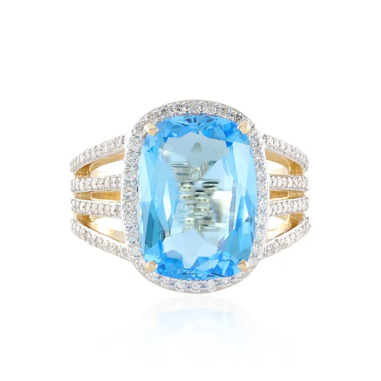 Unser Ring SUHANA besticht durch seine Raffinesse. Der antike Marambaia-Topas im Phantasieschliff von 7,038 Karat aus Brasilien wird von insgesamt 110 Diamanten SI2 (0,675 Karat) umringt. Dieser Ring aus 585er 14K-Gelbgold mit einem Gesamtgewicht von 7,19 g besticht durch seinen luxuriösen blauen Farbton und sein strahlendes Funkeln. Die Erhabenheit des 14×10 mm großen Topas wird durch das filigrane Banddesign noch verstärkt und macht ihn zu einem auffälligen Schmuckstück für Galaveranstaltungen oder als wertvolles Geschenk. Kombinieren Sie ihn mit eleganter Abendgarderobe, um jede Gelegenheit zu erhellen.