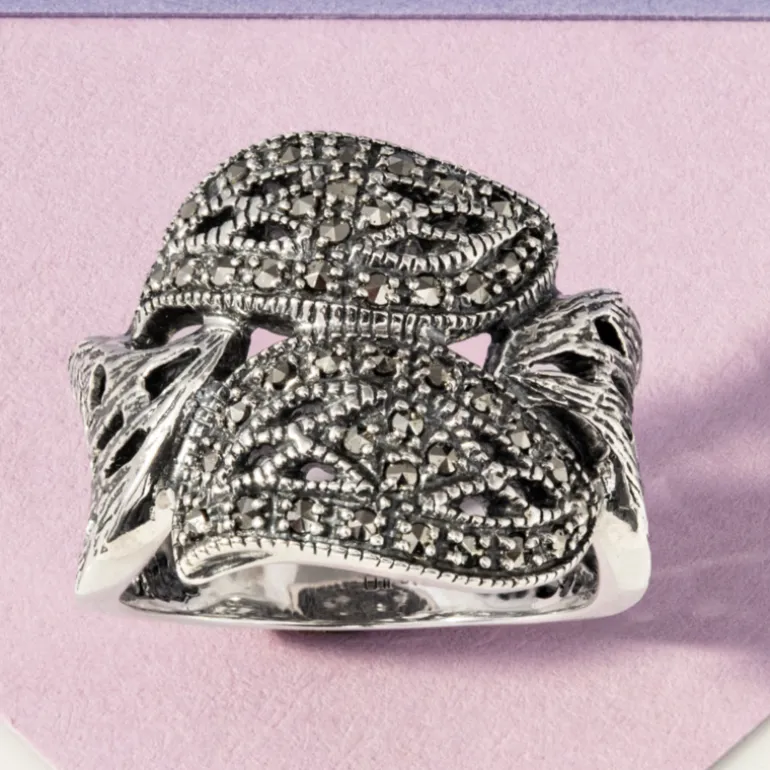 Entdecken Sie die zeitlose Anziehungskraft unseres österreichischen Markasit-Rings, der aus luxuriösem 925er Sterlingsilber gefertigt ist. Mit einem Gewicht von 0,344 Karat und 43 Markasiten im Rundschliff strahlt dieser Ring Vintage-Eleganz aus. Das komplizierte Design zeigt eine Reihe von funkelnden Steinen, die in einem raffinierten Muster von 20×20 mm gefasst sind. Der auffällige Kontrast macht ihn zu einem vielseitigen Accessoire, das sowohl tagsüber schick als auch am Abend glamourös ist und jedes Ensemble aufwertet.