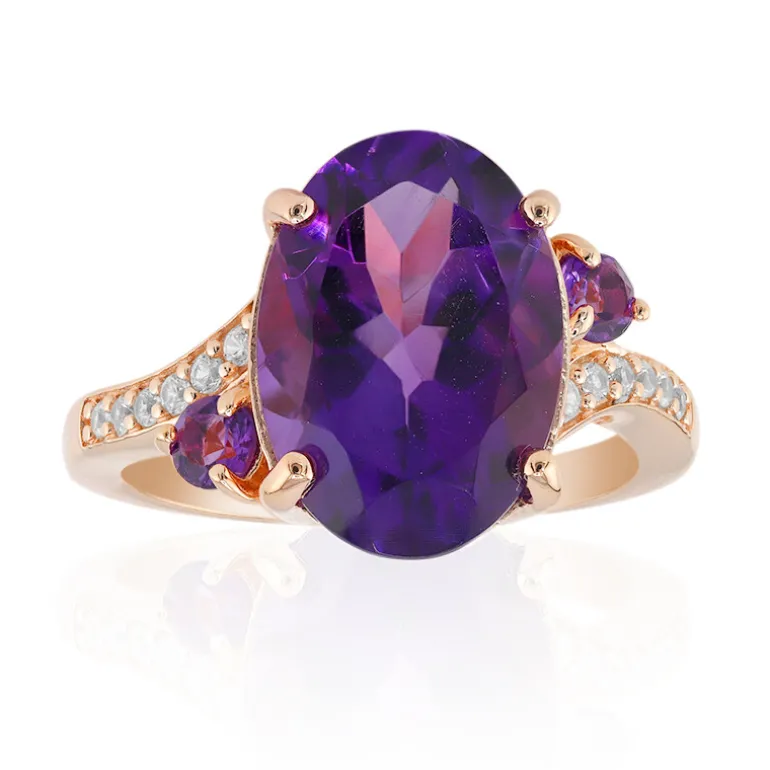 Entdecken Sie die Faszination des marokkanischen Amethysts in diesem atemberaubenden Ring mit einem zentralen ovalen 4,766-karätigen Edelstein, der von rosévergoldetem 925er Sterlingsilber umschlossen wird. Flankiert von zwei Amethysten im Rundschliff und zwölf funkelnden Zirkonsteinen aus Tansania setzt dieses Schmuckstück mit einem Gesamtgewicht von 5,117 Karat ein Zeichen. Sein bezaubernder violetter Farbton und sein elegantes Design machen ihn sowohl für den Tag als auch für den Abend geeignet. Kombinieren Sie ihn mit Ihrem Lieblingskleid für einen raffinierten Look oder mit einer einfachen Bluse für einen Hauch von Luxus im Alltag.