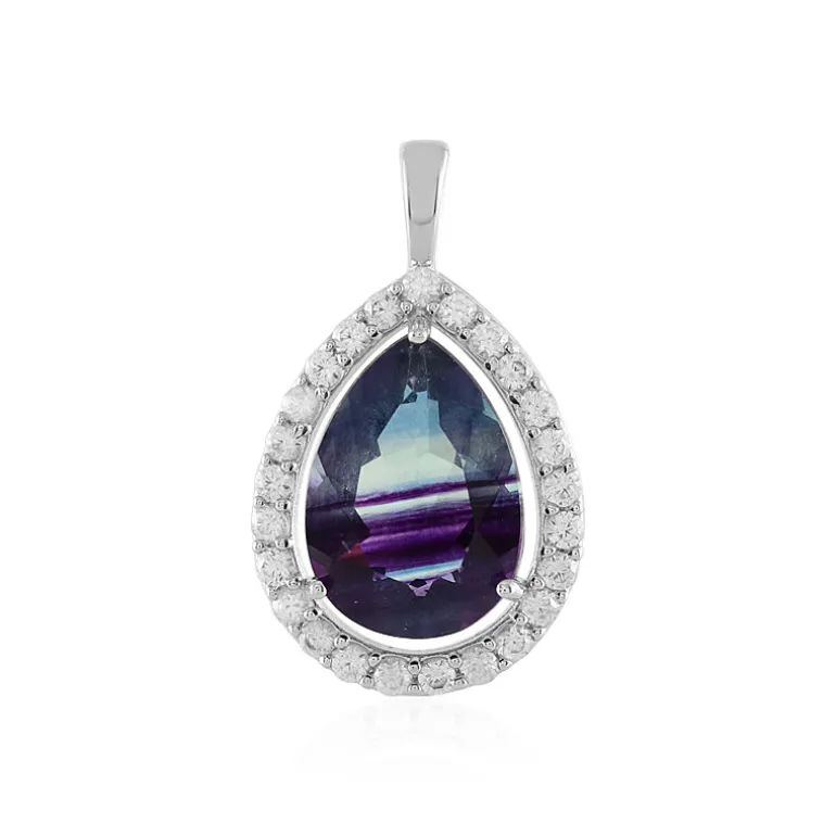 Entdecken Sie die fesselnde Anziehungskraft unseres mehrfarbigen Fluorit-Anhängers, umrahmt von schillernden Zirkonen und plattiertem 925er Sterling Silber. Dieses exquisite Stück besteht aus einem 5,059ct brasilianischen Fluorit, der meisterhaft in eine Birnenform geschliffen wurde, die seine lebhaften Farbschichten zur Geltung bringt, ergänzt durch 0,842ct funkelnde Zirkone aus Kambodscha. Mit seinen eleganten Maßen von 25 x 15 mm zieht dieser Anhänger alle Blicke auf sich. Seine Vielseitigkeit macht ihn zu einer auffälligen Ergänzung sowohl für legere als auch für formelle Kleidung und macht ihn ideal für verschiedene Anlässe, von Tagesausflügen bis hin zu eleganten Abendveranstaltungen.