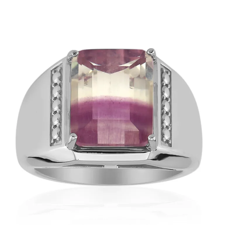 Dieser atemberaubende Ring zeigt einen faszinierenden mehrfarbigen Fluorit-Edelstein aus China, der fachmännisch in einer achteckigen Stufe geschliffen wurde, um seine natürliche Schönheit zu präsentieren. Mit einem Gewicht von beeindruckenden 4,76 Karat ist der Edelstein elegant in ein hochwertiges 925er Sterling Silberband eingefasst, das den Glanz dieses exquisiten Stücks noch verstärkt. Dieser Ring ist perfekt, um jedem Outfit einen Hauch von Raffinesse zu verleihen und eignet sich sowohl für zwanglose Zusammenkünfte als auch für formelle Anlässe. Seine einzigartige Farbpalette sorgt dafür, dass er in jeder Schmucksammlung hervorsticht.