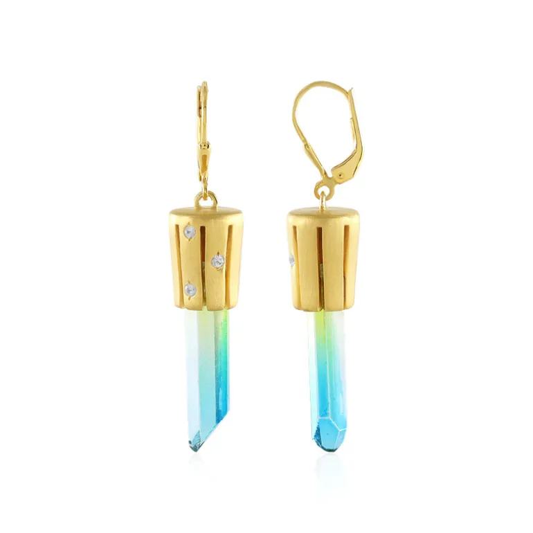Diese auffälligen Ohrringe aus vergoldetem Silber sind mit zarten, mehrfarbigen Quarzkristallen besetzt, die bei jeder Bewegung funkeln. Das einzigartige 46-mm-Tropfen-Design verleiht ihnen einen Hauch von Raffinesse und macht sie zu einer vielseitigen Ergänzung für jedes Outfit. Sie eignen sich perfekt für den Übergang vom Tag zum Abend und werden zu einem beliebten Teil Ihrer Schmucksammlung. Ideal für alle, die ihrem Ensemble einen Hauch von Farbe und Eleganz verleihen möchten.