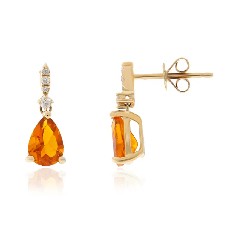 Entdecken Sie die Faszination unserer leuchtenden Ohrringe mit mexikanischem Feueropal, gefasst in luxuriösem 14 Karat Gelbgold und verziert mit funkelnden Diamanten. Jeder tropfenförmige Opal von 0,977 Karat ist eine feurige Symphonie von Farben, die durch schimmernde Diamantakzente von 0,065 Karat ergänzt wird. Diese Ohrringe eignen sich perfekt für Abendveranstaltungen oder als auffälliges Accessoire für die Eleganz des Tages und sorgen bei jeder Gelegenheit für Gesprächsstoff.