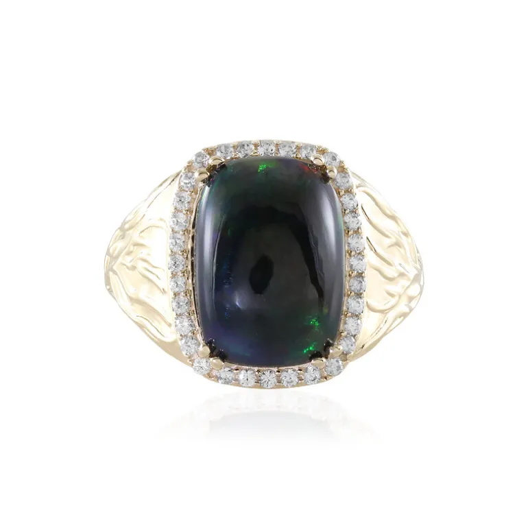 Entdecken Sie die schillernde Anziehungskraft dieses äthiopischen Mezezo-Opalrings, der von einem antiken Stein im Cabochon-Schliff von 2,69 Karat gekrönt wird. Der Opal misst ca. 14×10 mm und wird von 32 funkelnden Zirkonen aus Kambodscha mit einem Gesamtgewicht von 0,38 ct eingerahmt. Der Ring ist aus 9-karätigem Gold mit einem Gewicht von ca. 3,65 g gefertigt und versprüht einen Hauch von Vintage-Charme. Ein perfektes Schmuckstück für besondere Anlässe oder um Ihr Alltagsoutfit aufzuwerten.