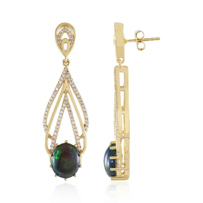 Entdecken Sie die Faszination dieser exquisiten Mezezo Opal-Ohrringe, die mit Opalen aus Äthiopien und schimmernden Zirkonen aus Kambodscha gefertigt wurden. In vergoldetem 925er Sterlingsilber gefasst, zeigt jeder Ohrring einen atemberaubenden Opal-Cabochon, der durch funkelnde Zirkon-Akzente hervorgehoben wird. Diese Ohrringe eignen sich perfekt für elegante Abende oder anspruchsvolle Veranstaltungen und verleihen jedem Outfit einen Hauch von Luxus. Tragen Sie sie zu einem eleganten Kleid für einen glamourösen Look.