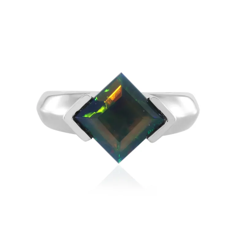 Entdecken Sie die Faszination dieses Rings mit Mezezo-Opal, der fachmännisch aus 925er Sterlingsilber mit einer glänzenden Platinbeschichtung gefertigt wurde. Der äthiopische Opal, der in einer auffälligen Carré-Form geschliffen ist, strahlt in leuchtenden Farben, die ihn zu einem perfekten Mittelpunkt für jedes Ensemble machen. Dieser Ring ist ideal für Abendveranstaltungen oder als eleganter Akzent zu legeren Outfits und ist eine fesselnde Wahl für jeden Schmuckliebhaber.
