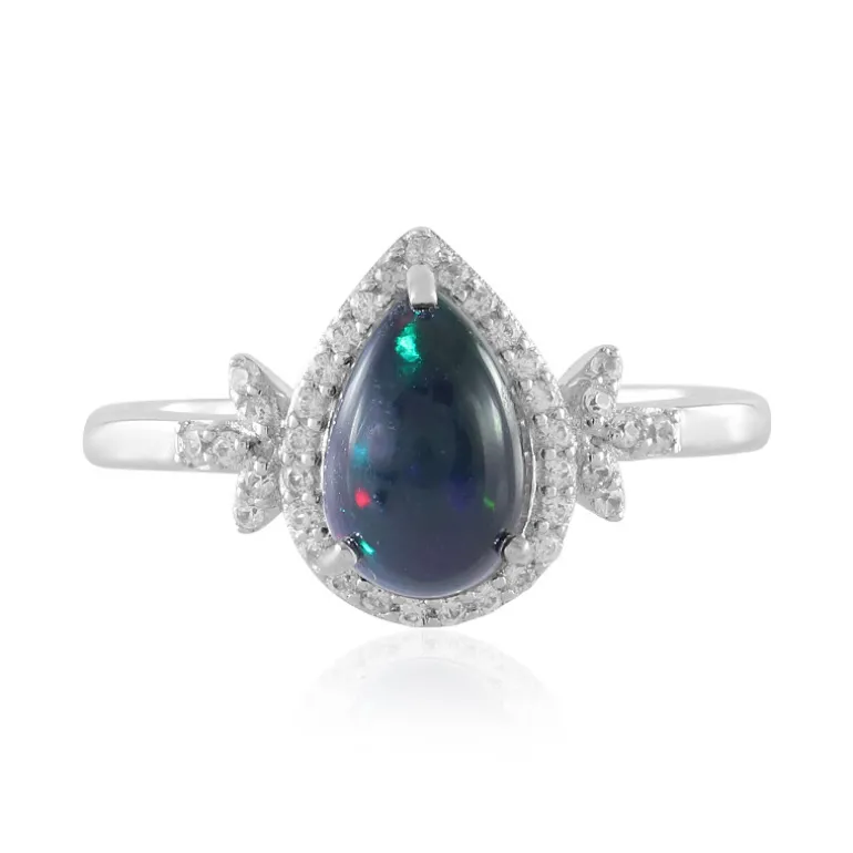 Entdecken Sie die bezaubernde Anziehungskraft dieses Mezezo-Opalrings mit einem atemberaubenden Cabochon aus äthiopischem Opal in Tropfenform. Die funkelnden Zirkone aus Kambodscha verleihen diesem Schmuckstück Eleganz und Raffinesse. Er ist perfekt für den Abend und passt hervorragend zu einem klassischen schwarzen Kleid für einen Abend oder eine formelle Veranstaltung. Ergänzen Sie Ihre Sammlung mit diesem zeitlosen Schmuckstück und verleihen Sie ihr einen Hauch von raffiniertem Glamour.