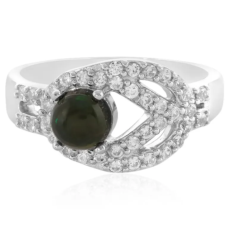 Entdecken Sie die Faszination des äthiopischen Mezezo-Opals in diesem schicken Ring aus 925er Sterlingsilber. Mit einem fesselnden Cabochon von 0,364 ct inmitten einer funkelnden Reihe von 38 kambodschanischen Zirkonen im Rundschliff von insgesamt 0,437 ct kombiniert dieser Ring Subtilität mit Funkeln. Die ineinander verschlungenen Silbermuster sorgen für einen modernen Look, der den Betrachter verzaubert. Er ist ideal, um der Alltagskleidung einen Hauch von Eleganz zu verleihen oder die Abendgarderobe abzurunden. Sein einzigartiges Farbspiel sorgt dafür, dass er in jeder Schmucksammlung auffällt.