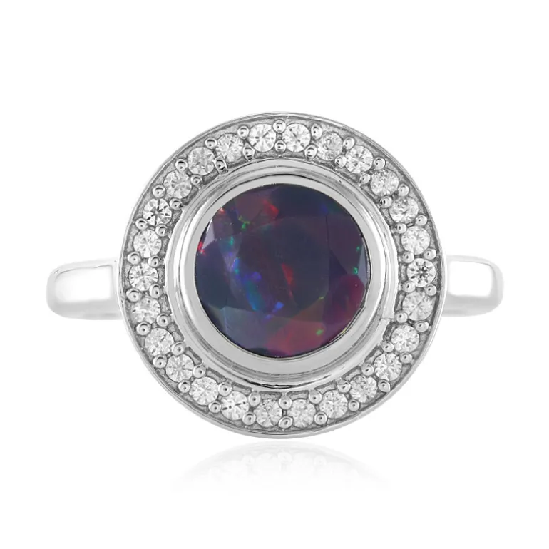 Entdecken Sie diesen bezaubernden Mezezo-Opalring aus Äthiopien, gefasst in glänzendes platiniertes 925er Sterlingsilber. Der zentrale Opal, der von 26 kambodschanischen Zirkonen ergänzt wird, fängt eine atemberaubende Palette von Farben ein. Dieser Ring eignet sich perfekt, um jedem Ensemble einen Hauch von Eleganz zu verleihen und ist ideal für besondere Anlässe oder einen stilvollen Abend. Erweitern Sie Ihre Schmucksammlung mit seinem fesselnden Charme.