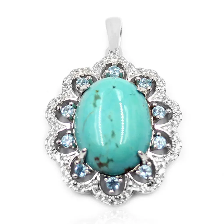 Entdecken Sie die Faszination des amerikanischen Südwestens mit diesem fesselnden Silberanhänger aus Türkis und Topas. Das Herzstück, ein 5,524-karätiger Türkis-Cabochon, hat einen ruhigen, ovalen Schliff und wird von schimmernden Schweizer Blautopasen und strahlenden Zirkonen aus Brasilien bzw. Kambodscha eingerahmt. Der aus 925er Sterlingsilber gefertigte Anhänger mit einem Gesamtgewicht von 6,3 ct ist ein Statement-Stück, das jedem Outfit einen Hauch von Farbe und Eleganz verleiht. Er eignet sich sowohl für zwanglose Ausflüge als auch für formellere Anlässe und passt hervorragend zu einer frischen weißen Bluse oder einem Abendkleid.
