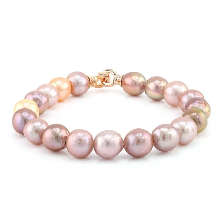 Gönnen Sie sich die luxuriöse Wärme dieses exquisiten Armbands mit einer fesselnden Auswahl an Ming-Perlen unterschiedlicher Größe aus China, die harmonisch aneinandergereiht sind. Jede schimmernde Perle spiegelt eine sanfte Pastellfarbe wider, die die 375er Goldschließe des Armbands mit einem Gewicht von ca. 2,1 g anmutig ergänzt. Mit einer Länge von 19,5 cm sitzt es zart am Handgelenk und eignet sich sowohl für zwanglose Anlässe als auch für prestigeträchtige Veranstaltungen. Dieses Armband passt hervorragend zu cremefarbenen Seidenblusen oder unterstreicht die Raffinesse eines frischen weißen Kleides.