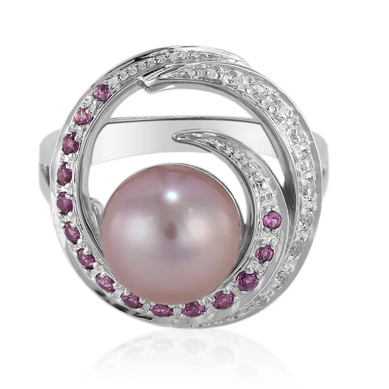 Dieser wunderschön gearbeitete Ring präsentiert eine glänzende 9 mm große runde Ming-Perle aus China, die von funkelnden Rhodolithen und Zirkonen aus Brasilien und Kambodscha umrahmt wird. Mit einem Gesamtgewicht von 0,412 ct, gefasst in hochwertigem 925er Sterlingsilber, ist dieses Schmuckstück nicht nur ein Gesprächsanlass, sondern auch ein Grundnahrungsmittel für jede elegante Garderobe. Perfekt für Abendveranstaltungen oder als raffiniertes tägliches Accessoire, ergänzt es sowohl formelle als auch legere Outfits und verleiht ihnen einen Hauch von Glamour.