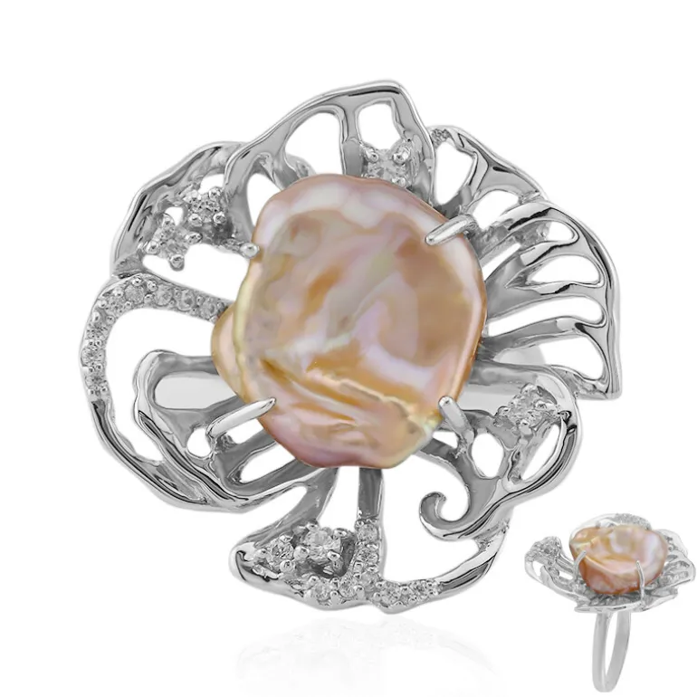 Dieser exquisite Ring zeigt eine schimmernde chinesische Ming-Perle, die in einer Fassung aus 925er Sterlingsilber mit einem Gesamtgewicht von 0,32 ct eingebettet ist. Akzentuiert von einer Kaskade funkelnder kambodschanischer Zirkone, machen seine einzigartige ausgefallene Form und sein elegantes Design ihn zu einem Statement. Er ist ideal, um jedem Outfit einen Hauch von Raffinesse zu verleihen und eignet sich perfekt für Abendveranstaltungen oder als besonderes Geschenk.