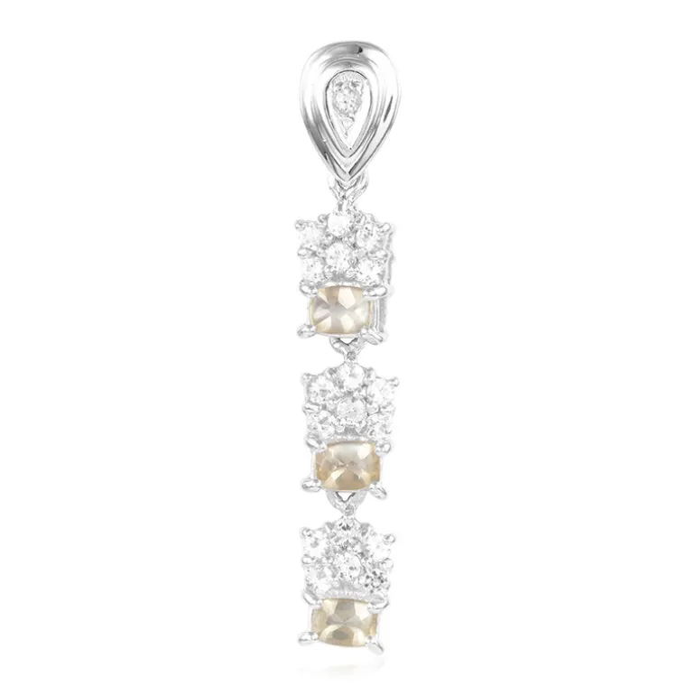 Mit seinen drei bezaubernden Moon Shimmer Sonnensteinen aus Madagaskar versprüht dieser exquisite Anhänger aus 925er Sterlingsilber Vintage-Charme. Die einzigartigen 0,4-karätigen Edelsteine sind im antiken Bufftop-Schliff geschliffen, was ihren ätherischen Glanz noch verstärkt. Elegant ergänzt werden sie durch 19 schimmernde weiße Topase aus Brasilien von insgesamt 0,482 Karat, die dem Design ein himmlisches Funkeln verleihen. Dieses elegante Stück wiegt etwa 2,57 g und hat eine beeindruckende Größe von 37 x 6 mm. Es ist ideal, um sowohl der Tages- als auch der Abendgarderobe einen raffinierten Touch zu verleihen und ist eine vielseitige Ergänzung für jede Schmucksammlung.