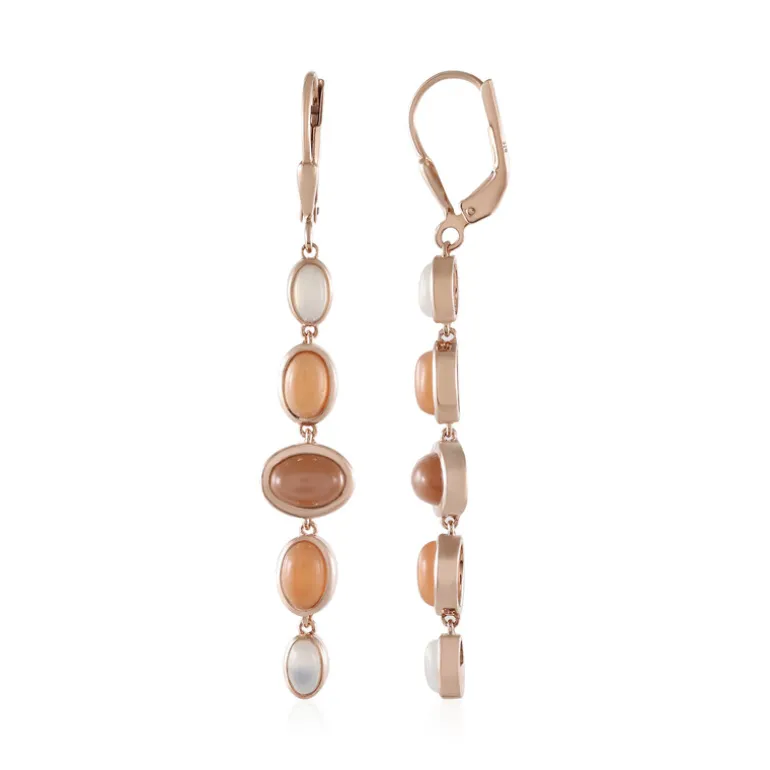 Diese atemberaubenden Ohrringe aus rosévergoldetem Sterlingsilber mit schokoladenfarbenen, pfirsichfarbenen und weißen Mondsteinen aus Indien versprühen Eleganz. Die ovalen Cabochons bilden eine harmonische Mischung von Farbtönen, die jedem Outfit einen Hauch von Raffinesse verleihen. Diese Ohrringe eignen sich sowohl für zwanglose als auch für formelle Anlässe und sind eine vielseitige Ergänzung Ihrer Schmucksammlung, die mit schickem Charme daherkommt.