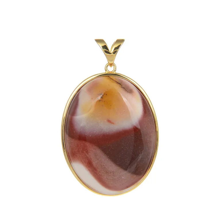 Entdecken Sie die warme, erdige Ausstrahlung dieses 80-karätigen australischen Mookaite-Anhängers, der elegant in einer Fassung aus 925er Sterlingsilber mit luxuriöser Goldplattierung untergebracht ist. Das subtile Zusammenspiel von kastanienbraunen, cremefarbenen und senffarbenen Tönen fängt die Essenz der natürlichen Schönheit des ovalen Cabochons ein und macht ihn zu einem vielseitigen Schmuckstück für jede Garderobe. Dieser Anhänger eignet sich perfekt für legere Ausflüge oder um Ihrer Abendgarderobe einen Hauch von Raffinesse zu verleihen und ist ein Beweis für einzigartige Handwerkskunst und Stil.