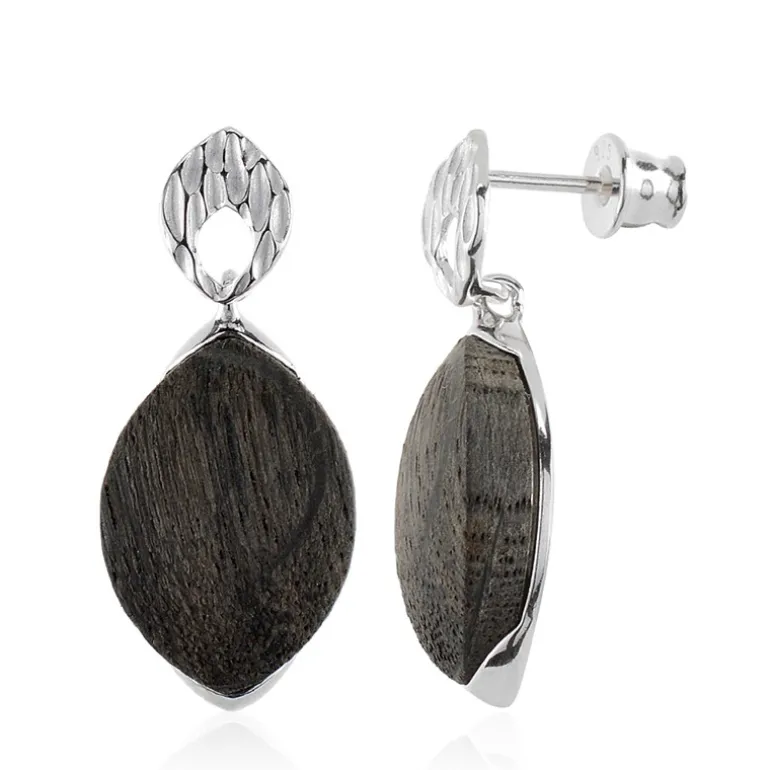 Diese Ohrringe wurden für die moderne Frau mit einer Vorliebe für die einzigartigen Kreationen der Natur entworfen und zeigen die Schönheit des polnischen Mooreiche-Holzes. Die Cabochons im Marquiseschliff wiegen insgesamt 4,32 Karat und sind elegant in 925er Sterlingsilber eingefasst. Mit einer ungefähren Länge von 28 mm verleihen diese Ohrringe sowohl legeren als auch formellen Anlässen ein erdiges, raffiniertes Flair. Das schlichte Design und die natürlichen Holzmaserungen sind perfekt für alle, die sich von der Natur inspirieren lassen und ein besonderes Schmuckstück suchen.