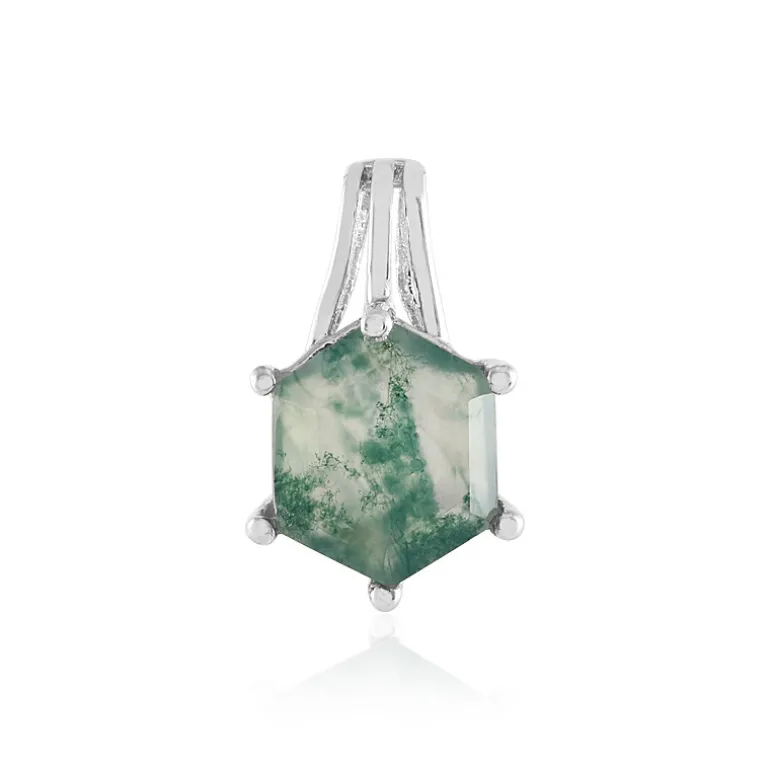 Entdecken Sie die bezaubernde Schönheit dieses Moosachat-Anhängers, bei dem die Kunstfertigkeit der Natur auf elegantes Design trifft. Der 3,645 Karat schwere Edelstein stammt aus den üppigen Landschaften Brasiliens und wurde sorgfältig in eine sechseckige Form geschliffen, um seine tiefgrünen Farbtöne mit faszinierenden moosartigen Einschlüssen zu betonen. Der Edelstein ist in glänzendes, platiniertes 925er Sterlingsilber gefasst und wiegt ca. 0,96 Gramm, was sowohl Haltbarkeit als auch Glanz garantiert. Er eignet sich perfekt zum Übereinanderlegen oder als einzelnes Schmuckstück und ist ein vielseitiges Accessoire für lässige Brunchs und elegante Abendveranstaltungen.