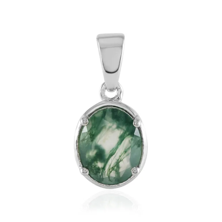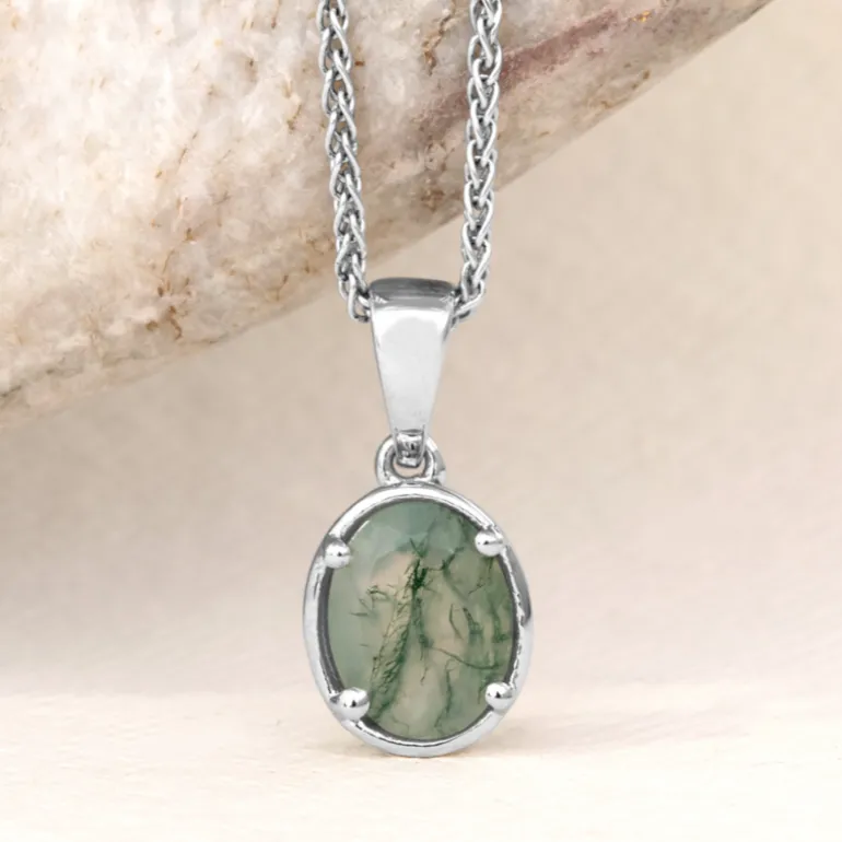 Dieser Anhänger aus brasilianischem Moosachat verzaubert mit der Pracht der Natur. Mit einem ovalen Edelstein von 1,36 Karat, eingefasst in platiniertes 925er Sterlingsilber, bietet dieser Anhänger einen Blick auf die üppigen, sanften Wälder. Die grünen Farbtöne harmonieren mit dem hochwertigen Silberglanz und lassen sich wunderbar mit erdigen Tönen oder einer weißen Bluse kombinieren, die einen Hauch von Eleganz ausstrahlt. Durch sein geringes Gewicht ist er den ganzen Tag über bequem zu tragen, so dass Sie immer ein Stück Kunst der Natur bei sich haben, wohin Sie auch gehen.