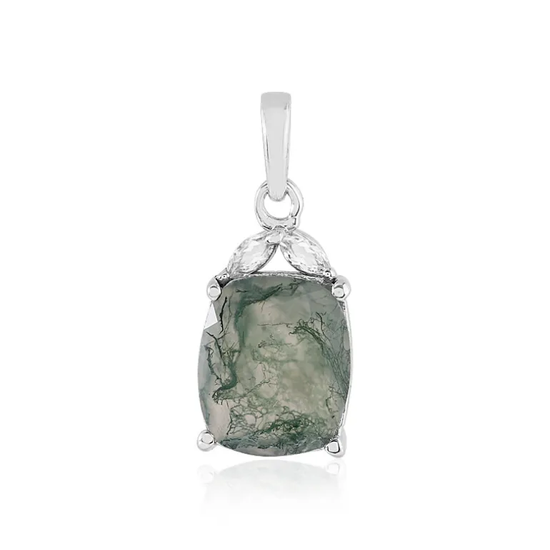 Entdecken Sie die natürliche Schönheit dieses fesselnden Anhängers mit einem reich gemusterten brasilianischen Moosachat, der von zwei weißen Topasen im Marquiseschliff akzentuiert wird. Dieser Anhänger aus platiniertem 925er Sterlingsilber mit einem Gewicht von 4,574 Karat verbindet rustikalen Charme mit einem Hauch von Eleganz. Ideal für von der Natur inspirierte Styles oder als einzigartiges, auffälliges Accessoire für den Alltag.