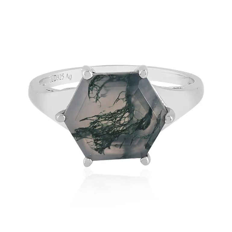 Sechseckiger brasilianischer Moosachat Platinbeschichteter Ring, 3,645 ct