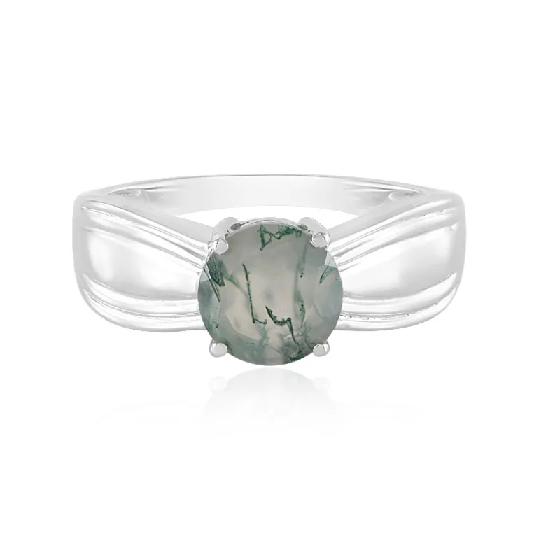 Entdecken Sie die natürliche Kunstfertigkeit dieses platinierten Rings aus 925er Sterlingsilber mit einem brasilianischen Moosachat mit einzigartigem grünem Marmorierungsmuster. Der 1,471 ct. große Edelstein ist meisterhaft rund geschliffen, misst etwa 8 mm im Durchmesser und ist in ein schlichtes und modernes Design gefasst, das den Achat zum Star der Show macht. Dieser Ring eignet sich perfekt, um Ihrer Garderobe einen Hauch von von der Natur inspirierter Eleganz zu verleihen, und ergänzt sowohl legere als auch formelle Looks.