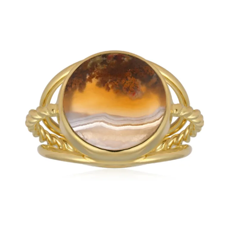 Entdecken Sie die bezaubernde Schönheit unseres Rings aus indonesischem Moosachat. Der 7,5 Karat schwere Stein mit erdigen Farbtönen ist in einer runden Cabochon-Fassung gefasst. Umgeben von einem vergoldeten 925er Sterlingsilberband, strahlt dieses Schmuckstück einen warmen Glanz aus, der durch das einzigartige, von Bali Barong inspirierte Design ergänzt wird. Er ist ideal, um jeder Kleidung einen exotischen Touch zu verleihen, und ist vielseitig genug, um sowohl tagsüber als auch abends getragen zu werden. Der große Edelstein macht ihn zu einem Highlight für jede Schmucksammlung.