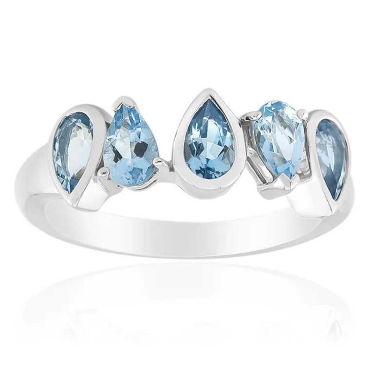 Entdecken Sie die Eleganz dieses Rings aus Sterlingsilber mit fünf exquisiten Aquamarinen aus Mosambik im Birnenschliff. Mit insgesamt 0,765 Karat strahlen diese Edelsteine in einem beruhigenden Blauton, der perfekt ist, um Ihrer Alltags- oder Abendgarderobe einen Hauch von Eleganz zu verleihen. Dieser Ring eignet sich ideal für besondere Anlässe und ist ein schöner Ausdruck von raffiniertem Stil und Anmut.