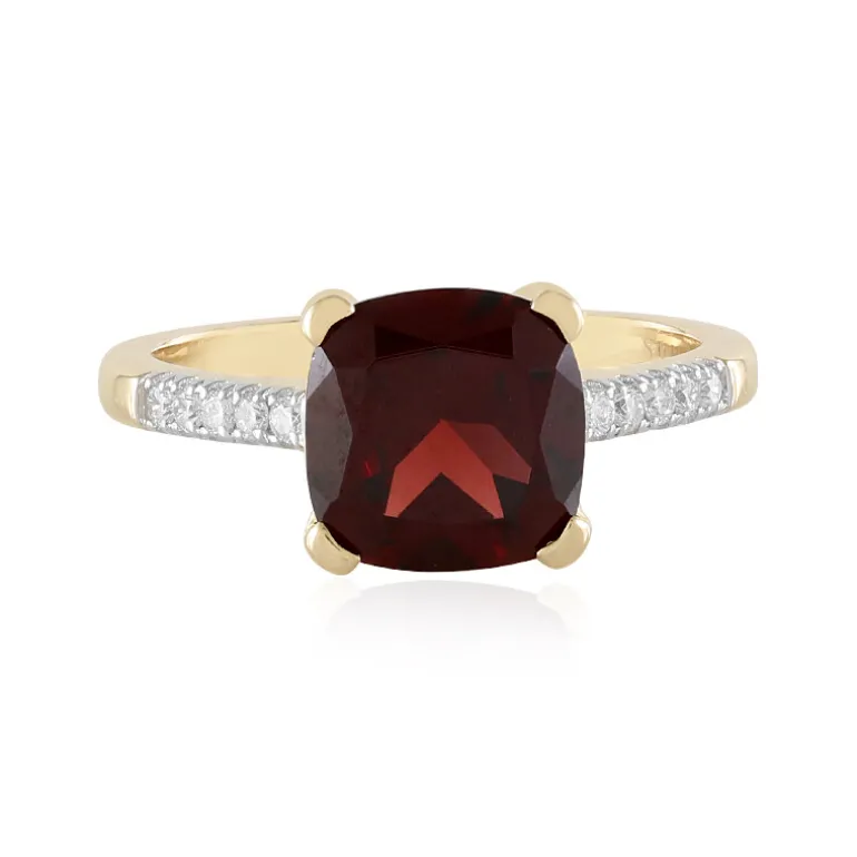 Entdecken Sie die Eleganz dieses Goldrings mit Mosambik-Granat, einem tiefroten Edelstein im Kissenschliff von 2,997 Karat, der von 10 in 14 Karat Gelbgold gefassten Brillanten akzentuiert wird. Perfekt, um der Abendgarderobe einen Hauch von Raffinesse zu verleihen oder ein Freizeitoutfit aufzuwerten. Die Kombination aus klassischem Design und auffälligen Edelsteinen macht diesen Ring zu einer exquisiten Wahl für jede Schmucksammlung.