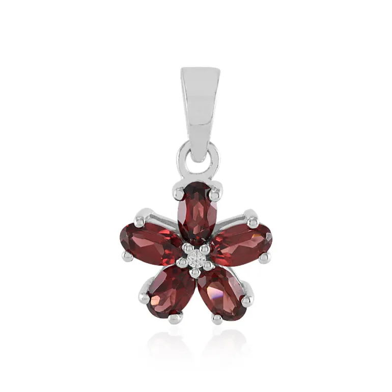 Entdecken Sie die Wärme Mosambiks mit diesem bezaubernden Silberanhänger mit fünf oval geschliffenen Granaten von insgesamt 1,375 Karat, die anmutig in einem floralen Muster angeordnet sind. Das in platiniertem 925er Sterlingsilber gefasste Schmuckstück wird durch einen funkelnden kambodschanischen Zirkon akzentuiert und strahlt Charme und Raffinesse aus. Mit einem Gesamtkaratgewicht von 1,392 ct ist er das perfekte Accessoire, um jedem Outfit einen Hauch von naturinspirierter Eleganz zu verleihen, ob im Alltag oder zu besonderen Anlässen.