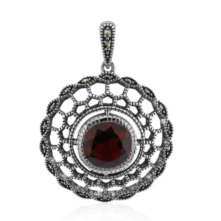 Entdecken Sie die Anziehungskraft dieses bezaubernden Granatanhängers aus Mosambik, der in glänzendes 925er Sterlingsilber gefasst und mit funkelndem rumänischem Marcasit verziert ist. Der zentrale Stein ist ein Granat im Rundschliff mit einem Gewicht von 3,15 Karat und einem satten, burgunderroten Farbton, der durch die filigrane Silberverzierung ergänzt wird. Dieser Anhänger ist ein zeitloses Schmuckstück, das Ihrer Abendgarderobe einen Hauch von Vintage-Eleganz verleiht und Ihre Schmucksammlung aufwertet.